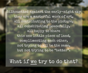 Silhouetted against the early-night sky they are a masterful work of art, all contributing to the picture, all cohabitating peacefully, all happy to share this one piece of land, complimenting each other, not trying to all be the same, but not trying to be “better”.