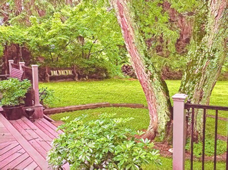 The path lights in front of the home across the cul-de-sac create dancing circles of light on the wet pavement.