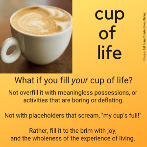 Not overfill it with boring or uninspiring activities or meaningless possessions. (Do you ever fill your life with tangible stuff to drown out the lack of real stuff?) Not overload it with placeholders that scream “my cup’s full!”. But, rather, fill it to the brim with the wholeness of the experience of living.