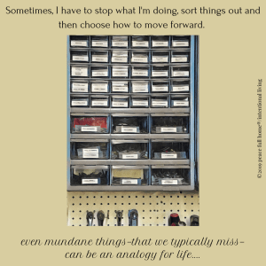 Yesterday, I was downstairs in the shop organizing hardware storage cabinets. Small bins hold everything from nails and screws to plumbing and electrical parts, and they’re all labeled by their contents, so we know where things are. The process is pretty mindless. For example, screws are separated by drives like slotted, Phillips, and hex.
