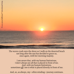 The waves crash onto the shore as I walk on the deserted beach not long after the sun has decided to grace us, once again, with her morning majesty. I am aware that, with my human limitations, I don’t always see all that is placed in front of me. And, with my human limitations, sometimes all I see is what is placed directly in front of me.