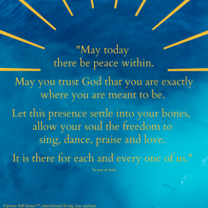 “May today there be peace within. May you trust God that you are exactly where you are meant to be. May you not forget the infinite possibilities born of faith. May you use those gifts you have received and pass on the love that has been given to you. May you be content knowing you are a child of God. Let this presence settle into your bones and allow your soul the freedom to sing, dance, praise, and love. It is there for each and every one of us.”