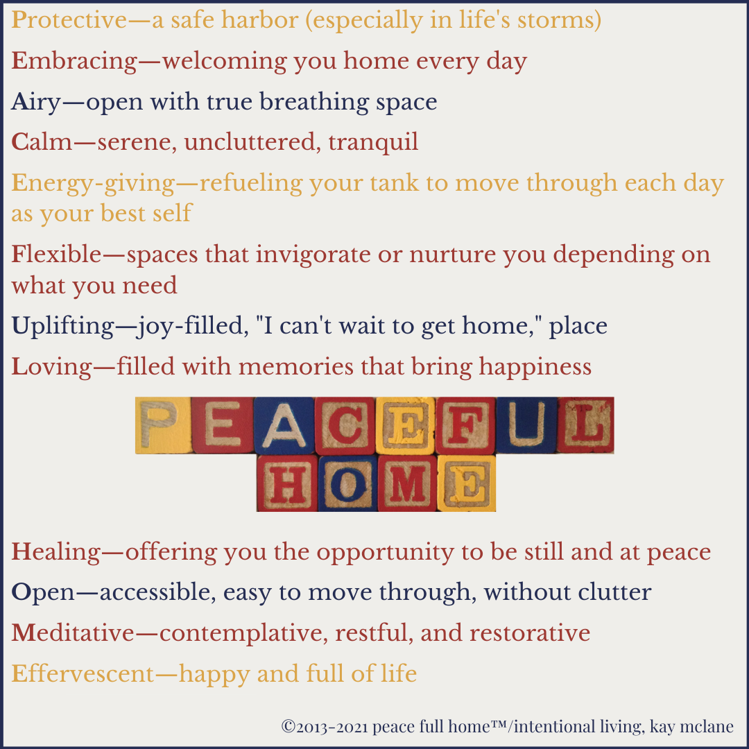 Years ago, I looked through a basket of old toys to see if I could find blocks to spell “PEACE FULL HOME.” I only had one “L” but found enough to make “PEACEFUL HOME.” Some had green, brown, or orange letters, but interestingly, the ones I needed were all primary colors: red, yellow, and blue. (I often talk about the power color has on how your home “feels,” so the irony of the primary color blocks was significant to me!)