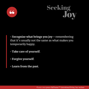 To experience the peace that comes from being filled with joy, you first have to acknowledge what—on a core level—matters to you. Your partner, children, parents, and friends count, of course, but until you understand what fills your heart and soul, you are less well-equipped to “be present and joyful” for anyone else. Second, to move fully into joy, you need to be right with God and yourself. Without those two parts in place, it’s challenging to be right with other human beings.