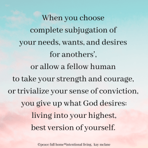 When you choose complete subjugation of your needs, wants, and desires for anothers’, or allow a fellow human to take your strength and courage, or trivialize your sense of conviction, you give up what God desires: living into your highest, best version of yourself.