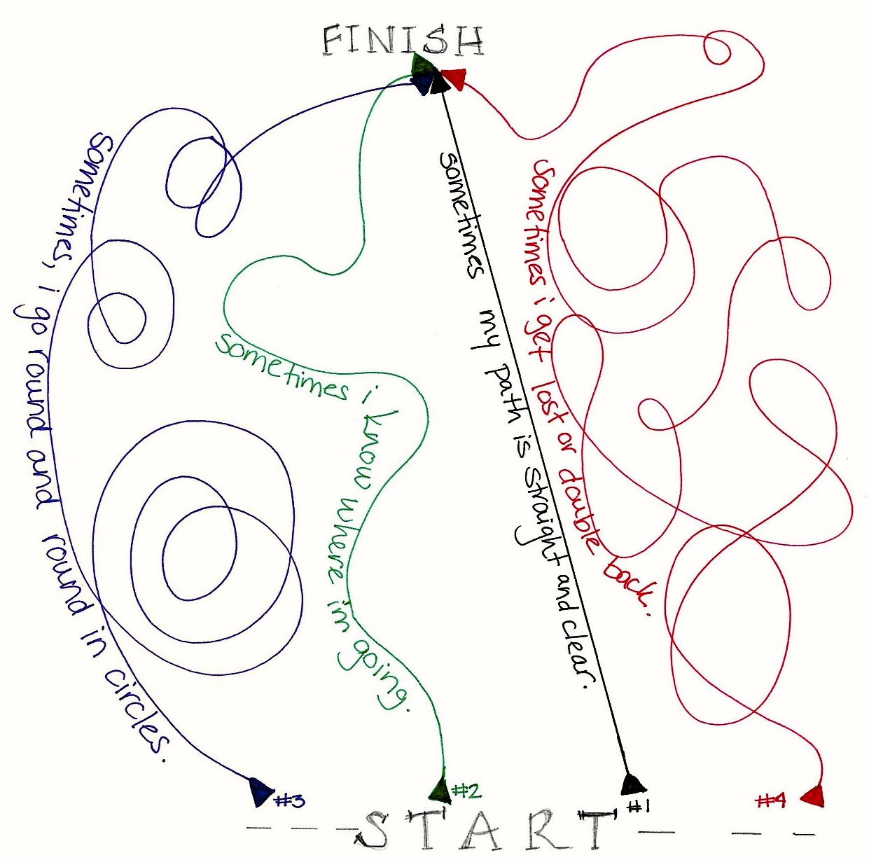 Path 1 is easy. I head out and fairly quickly get to the finish line. However, in those travels, I often miss the view…the little nuances that make the journey worthwhile. Path 2, the one with curves, adds interest—the slight bends along the way show me a different “life landscape,” but I still efficiently reach the endpoint.