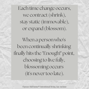 If you feel as if you’re continually shrinking (metaphorically, not physically) and finally hit the “ENOUGH!” point, you choose to live fully, and blossoming occurs (it’s never too late).