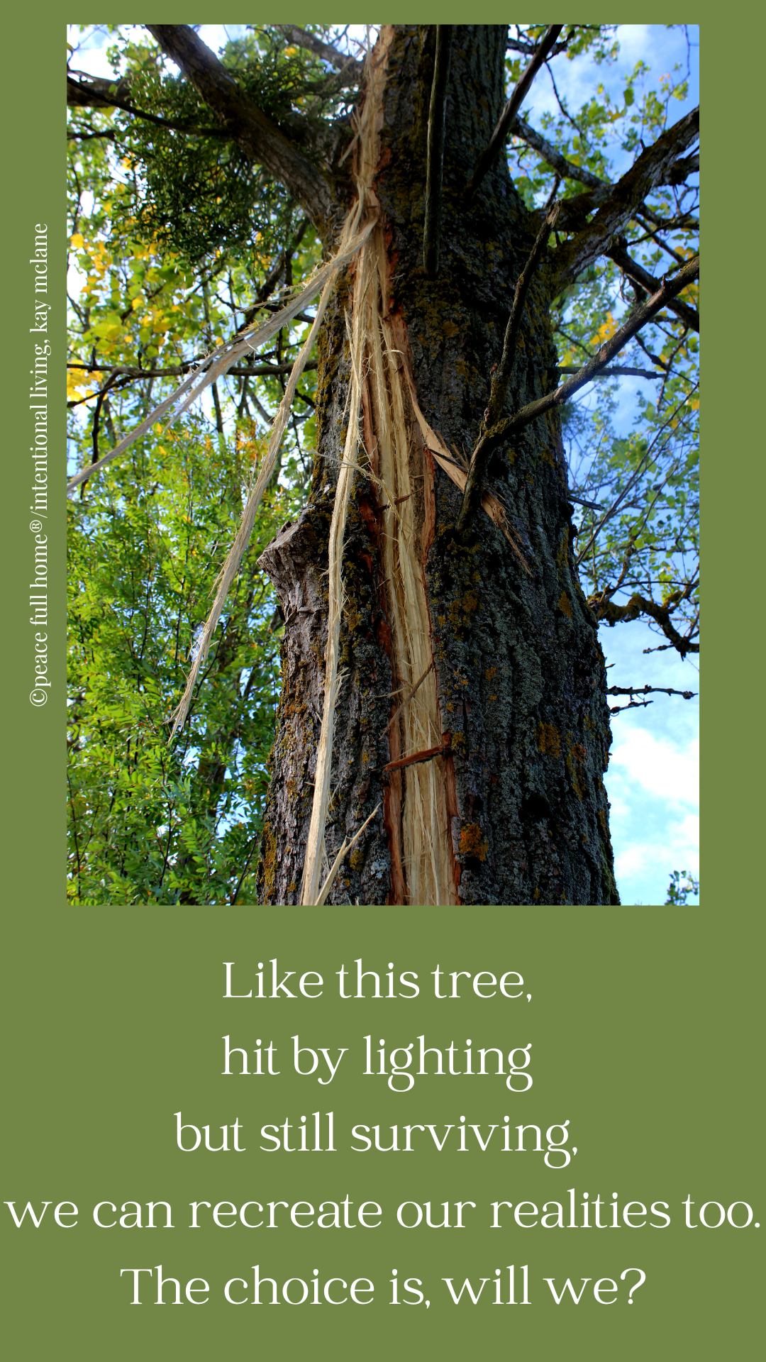 Like this tree, hit by lighting but still surviving, we can recreate our realities too. The choice is, will we?