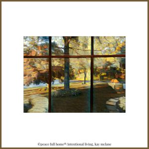 I pick up my mug—inscribed with “A Cup Of Peace”—a gift from my friend Maggie—and see the past, the fleeting now, and the unknown future. And again, glancing out the window, words roll through my mind.