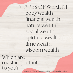 • Spiritual Wealth: a connection to a higher power, communing and being in touch with nature and the universe’s energy.
