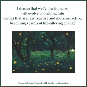 Alas, hope does not always seem “to spring eternal” on our earth. Perhaps it never did. Yet, I want to believe that profound possibilities and a radical shift will still occur. I dream that we fellow humans, will evolve, morphing into beings that are less reactive and more proactive, becoming vessels of life-altering change so that we can dance with joy for the potential our reality holds so that we can say with conviction, “All people are equal in value in the light of truth.” United, we can be the catalyst that creates radical transformation. United, we can become love.