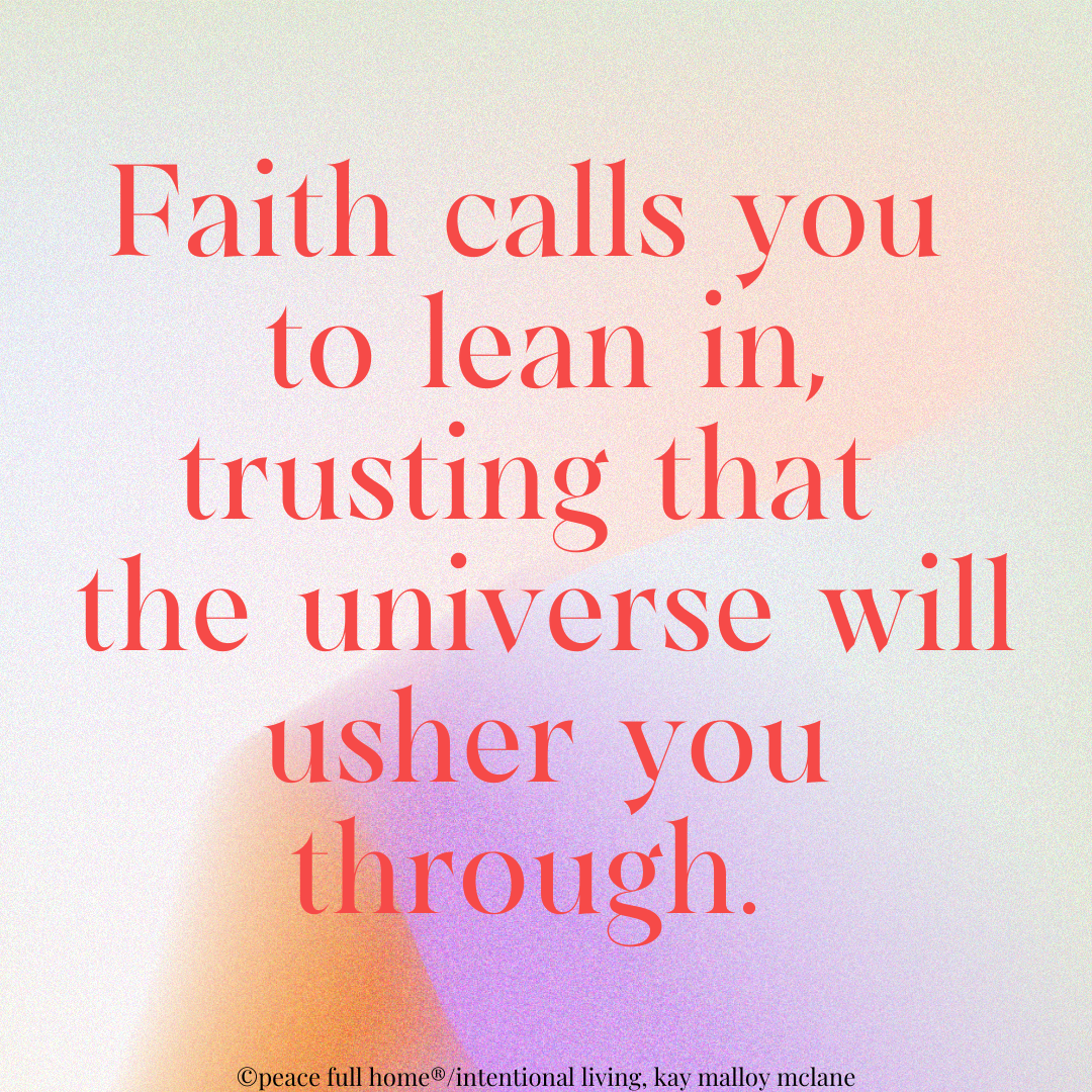 Faith calls you to lean in, trusting that the universe will usher you through— guiding you intuitively, even when you don’t recognize it. Faith has a constancy that envelops you, shelters you from turmoil, and reminds you of your intrinsic and unique value.